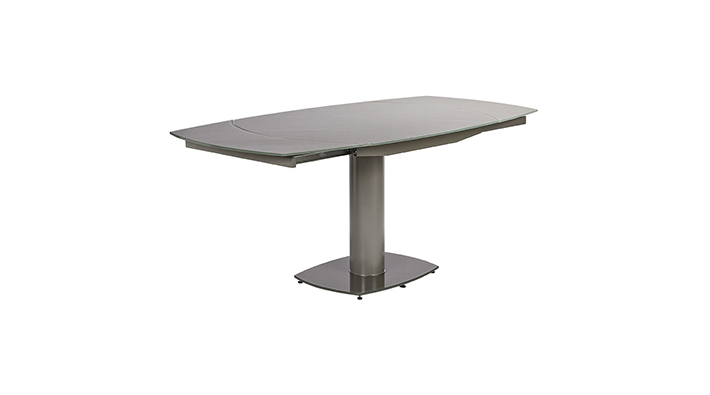 extendable table with atempered glass top, shapedlike a barrel. This detail,